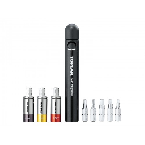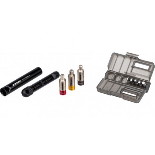 Komplet vključuje 4,5 in 6 Nm prednastavljene moment ključ in pet nastavkov (3 / 4/ 5 mm hex - T20 / T25 torx ). Moment ključ Topeak je najtanjši možni izvijač na voljo. Je natančno oblikovano, visoko kakovostno orodje za domačo ali strokovno uporabo. Možno shranjevanje dveh nastavkov v ročaju.