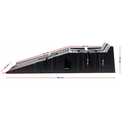 S temi robustnimi rampami lahko varno delate pod svojim vozilom ali prečkate visoke robove robnikov na pnevmatikam prijazen način. Ne glede na to, ali gre za avtomobile ali športna terenska vozila, so prožne rampe primerne za različne modele in tudi nižja vozila za te rampe ne predstavljajo težav. Zahvaljujoč svoji trpežni plastični konstrukciji imajo rampe ne le veliko večjo zanesljivost kot jeklene klančine, temveč imajo tudi protizdrsne lastnosti optimalen oprijem. Zahvaljujoč svoji lahki teži in popolnemu prileganju lahko rampe enostavno prevažate in zložite skupaj, da prihranite prostor. Zahvaljujoč izboljšanemu profilu vaše vozilo dobi varen in stabilen oprijem in z največjo obremenitvijo do 2500 kg lahko rampe sprejmejo vozila s širino pnevmatik do 255 mm.