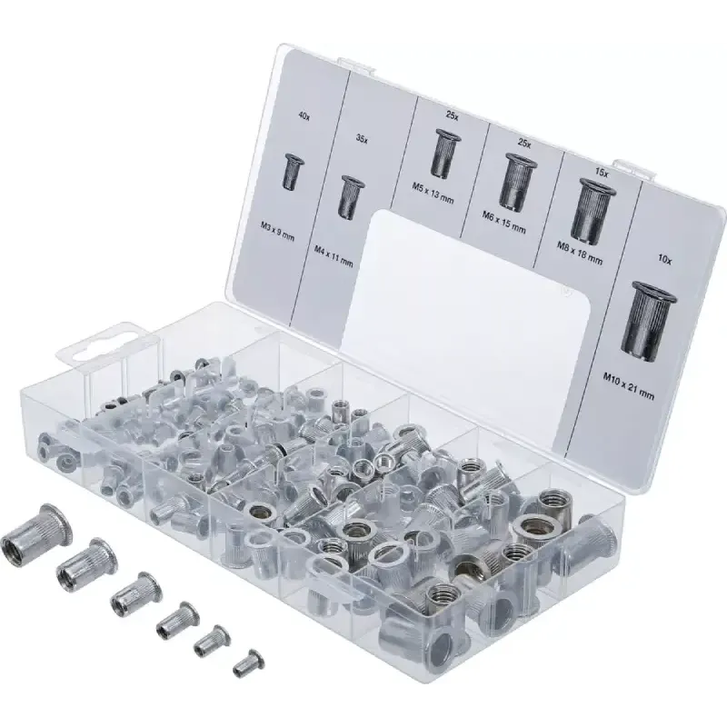 150-delni set aluminijastih slepih matic BGS Technic je idealna rešitev za izdelavo močnih in zanesljivih navojnih pritrditev v tankih materialih, kjer klasično vrezovanje navojev ni možno. Set je primeren za uporabo v avtomobilski industriji, kovinarstvu, vzdrževanju, delavnicah in domačih projektih.