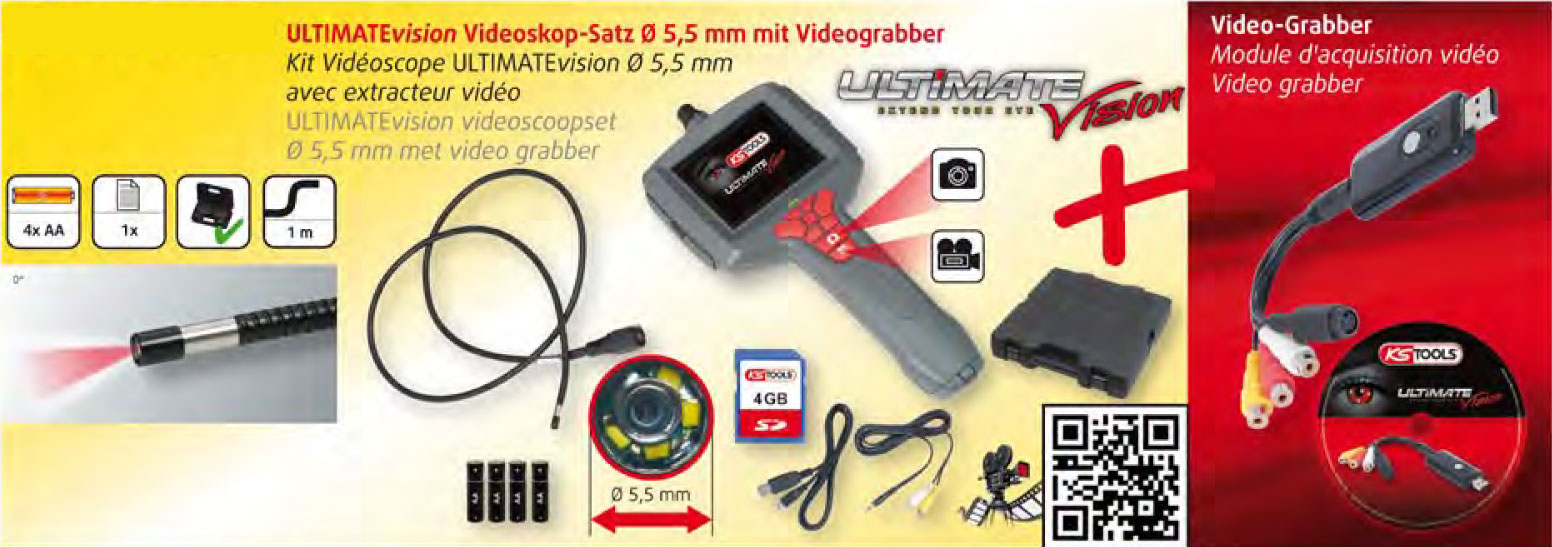 Videoskop z TFT monitorjem - Mini barvna kamera z LED osvetlitvijo - Dolžina vratu 1000 mm - Tehnični podatki: Sonda premer: 5,5 mm Napetost: 4 Mignon baterije AA (niso vključene) V kovčku.
